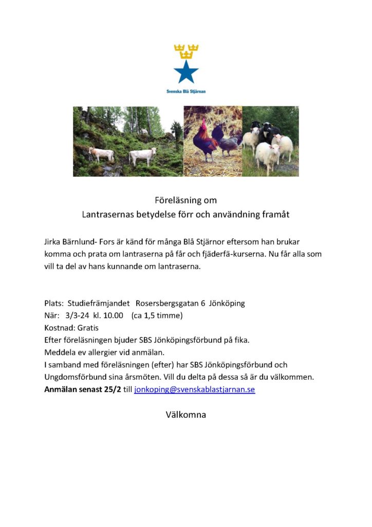Svenska Blå Stjärnan Jönköpings förbund bjuder in alla intresserade till en föreläsning den 10 november med Ulla-Carin Carlsson-Lindkvist, tidigare ridande polis med sin kända polishäst Utter.